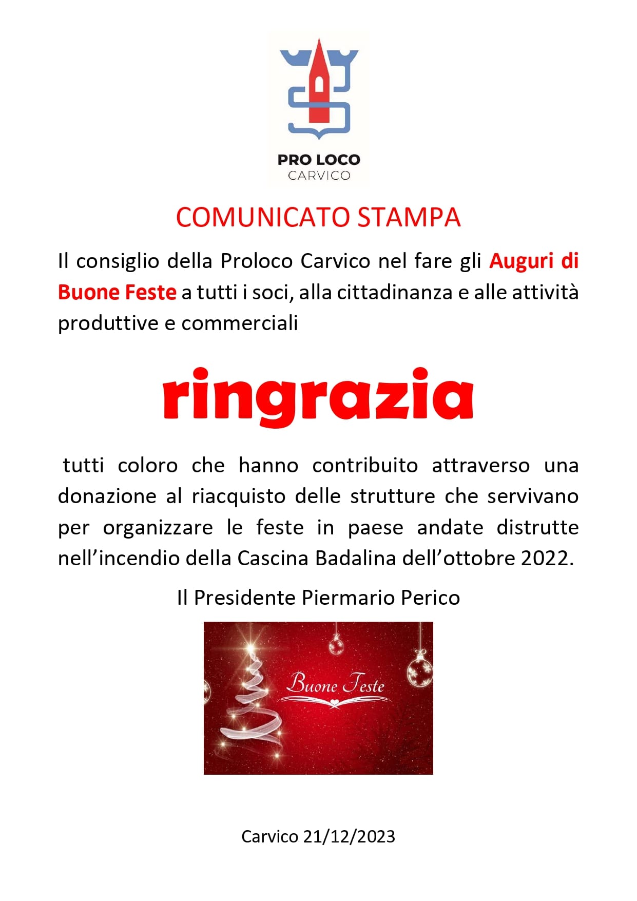 Il Consiglio della Proloco Carvico nel fare gli Auguri di Buone Feste a tutti i Soci, alla cittadinanza e alle attività produttive e commerciali ringrazia tutti coloro che hanno contribuito attraverso una donazione al riacquisto delle strutture che servivano per organizzare le feste in paese andate distrutte nell'incendio della Cascina Badalina dell'ottobre 2022.
