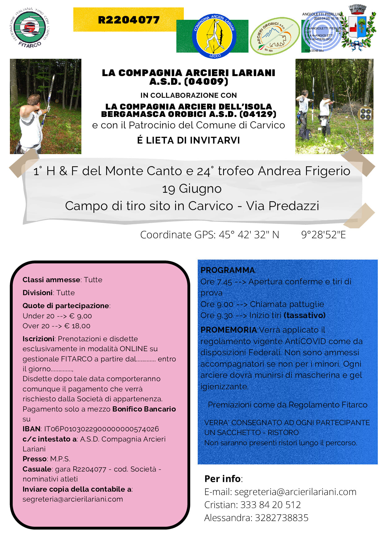 La Compagnia Arcieri Lariani A.S.D. (04009) in collaborazione con La Compagnia Arcieri dell'Isola Bergamasca Orobici A.S.D. (04129) e con il patrocinio del Comune di Carvico è lieta di invitarvi al 1° H&F del Monte Canto e 24° trofeo Andrea Frigerio